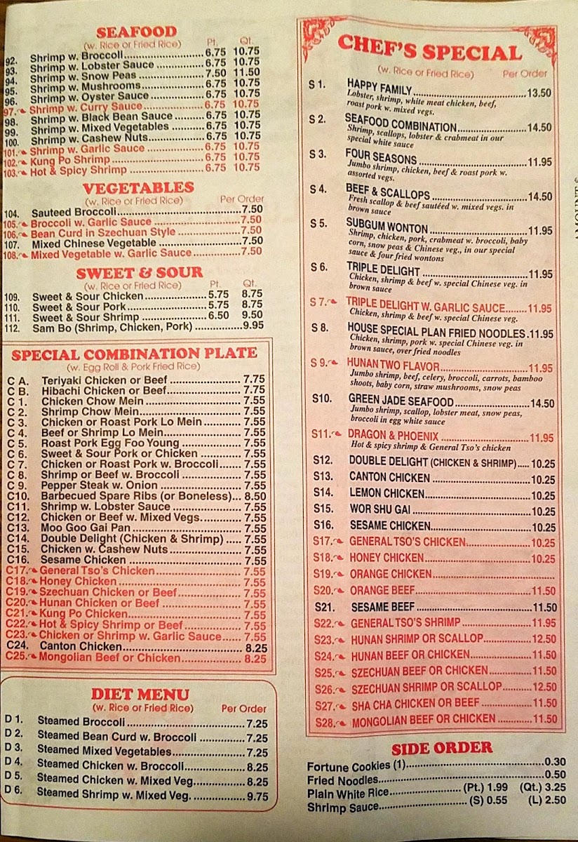 You'll find well-prepared vegetable dishes like sautéed broccoli and mixed vegetables with garlic sauce alongside a range of special combination plates featuring favorites such as General Tso's chicken, sesame chicken, and various lo mein and chow mein options. The menu also includes flavorful Szechuan and Hunan-style dishes for those who enjoy a bit of spice.